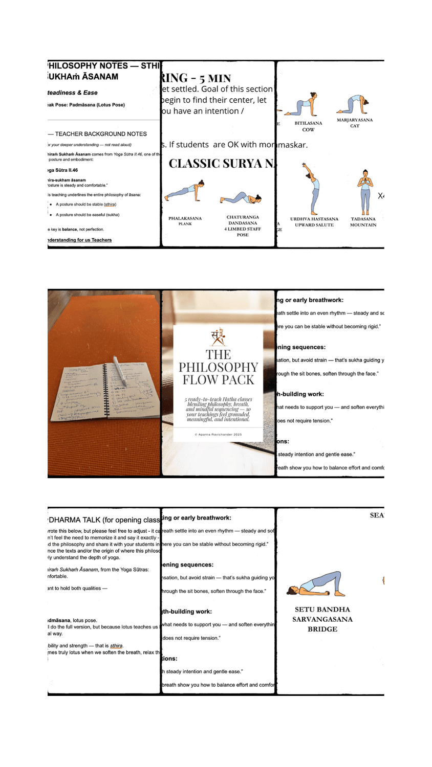 4+ pages of structured notes for each class to guide your teaching (quotes from yogic texts, explanations & more).